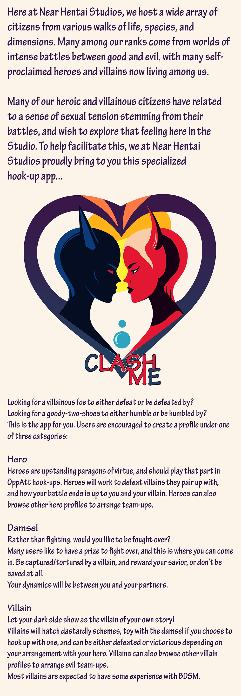 So I mentioned a while ago taking a break from the Studio Life Magazine covers, but that I’d be placing a different solo character series in that spot. This is that. This is a combination of a few old ideas, spurred on by a discussion with a Subscriber. The first post kinda explains the premise, but basically this is a hook-up app for heroes and villains looking to do some roleplay in the Studio. I’ve done a few pics already leaning into some characters enjoying this dynamic, so for this series we’ll get to see their profiles. Since there’s three types of ClashMe profiles, I’ll cycle through the types each time, with Subscribers voting on who gets the spotlight. The first one was decided a while ago, but it was for Sailor Venus. Since this is a preliminary run for this series I hope it’ll be fun for y’all, and I’ll be back in about a month with a “damsel” profile.