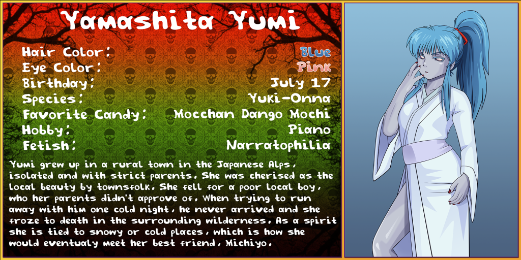 For the Halloween season this year I’m planning to get out two Spookyverse Bios, and this is the first one. For the Halloween pic in 2017 I introduced Yumi here and her best friend, Michiyo, who will be the other bio at a later date. I’ve seen some pretty fair comparisons of Yumi to Yu Yu Hakusho’s Botan, but she was actually inspired by Aoi from GeGeGe no Kitarō. Yumi was originally an unnamed ghost character who would’ve briefly joined the main party in Eromugen, before being repurposed here as a Spookyverse lady. The Eromugen version would’ve just been a generic ghost, but like Aoi Yumi is a yuki-onna, a type of female snow ghost you may have seen show up in other anime or the like before. I’ll talk a little more about her connection to Michiyo when that bio drops soon.