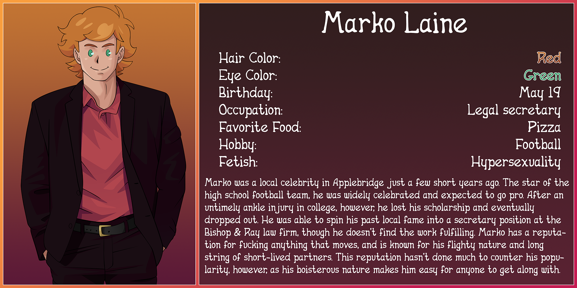 I don’t know how many people will remember Marko here, but he showed up in an Applebridge Snapshot back in 2020. I know a lot of people immediately associate him with Mirio from MHA, for obvious reasons, but he’s actually based on both Mirio and a Pokémon character named Milo. Both have a number of things in common, and the idea for Marko was just that he’d be the same type of boy as them, even down to his name having the same similarities. Marko has a larger role to play much much later on down the line in Sunkissed Youth, so I thought it might be prudent to get a bio out for him. I have a couple more bios planned for characters who will eventually play a role in SY, so look for those sometime in the near future.
