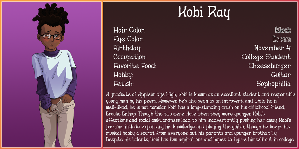 Here’s the bio page for Kobi Ray, the protagonist of Sunkissed Youth (which I am still working on). This one’s kinda ironic in that he’s wearing much more clothing here than his only other appearance so far, despite having yet to appear nude in any of my work. We’ll get to that eventually, though, but in the meantime hope you all enjoy the chance to get to know him a little better.
